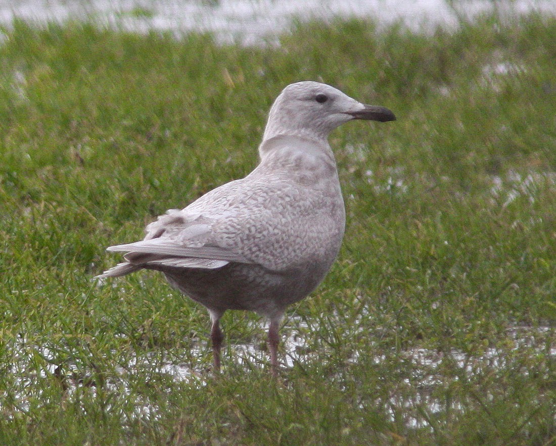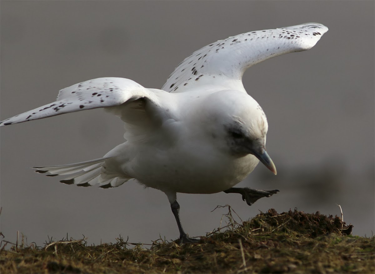 Using unique plumage patterns to differentiate between individuals is now a regular feature of high resolution digital photography these days and has been used in a number of cases to detect individuals at differing locations (see the posts below about the recent influx of Kumlien's Gulls for example). However, using the exact pattern of black on the face of this Ivory Gull would be misleading – the black spots would move over time!